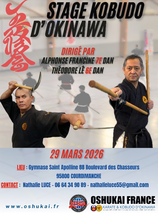 Un stage de Kobudo d’Okinawa aura lieu à Courdimanche, sous la direction de Maître Alphone Francine (7ème dan) et Maître Théodore Lê (6ème dan). Le Kobudo d’Okinawa, art des armes traditionnelles, est le complément naturel du Karaté-Do. Partageant les mêmes racines et principes (postures, déplacements, philosophie), sa pratique permet d’enrichir et d’approfondir votre compréhension des arts martiaux. C’est une excellente opportunité pour vos élèves de découvrir ou de perfectionner cette discipline.